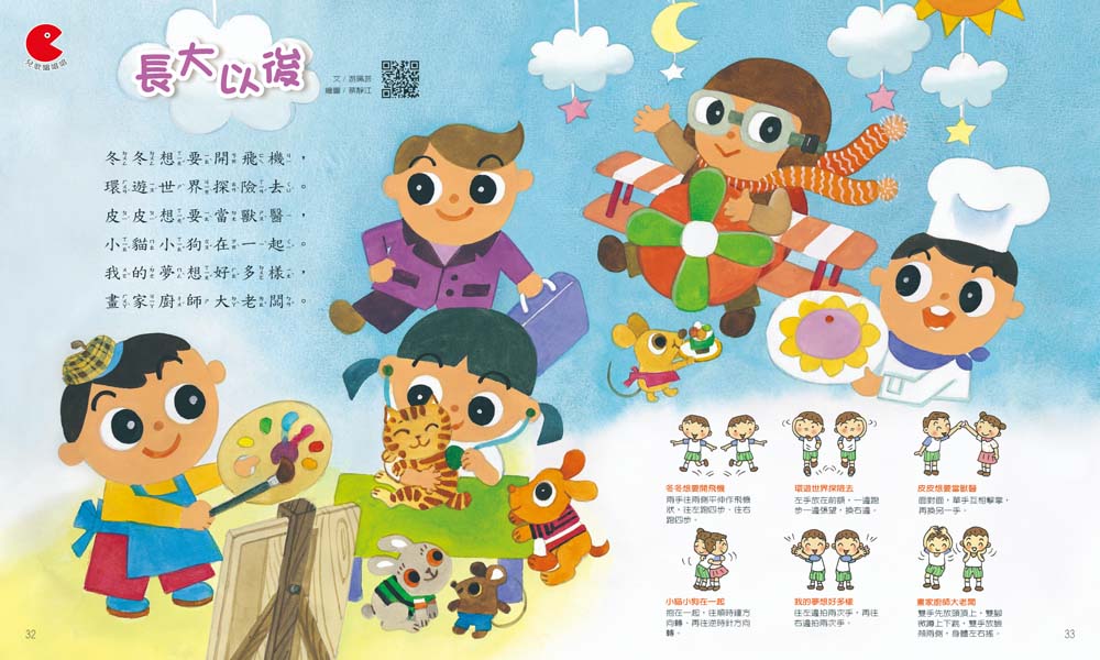- 國語兒歌:朗朗上口的歌詞、活潑好唱的旋律,搭配肢體的律動,同時增進語文能力與韻律感。